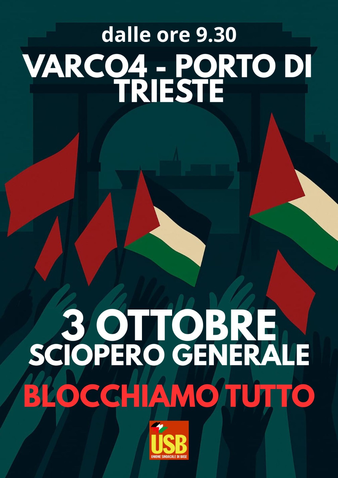 Lo scrivente sindacato USB – Unione Sindacale di Base ricorda la convocazione dello Sciopero generale nazionale di tutte le categorie lavorative private e pubbliche, per l’intera giornata di venerdì 3 ottobre 2025, con manifestazione e presidio al varco 4 del Porto di Trieste.